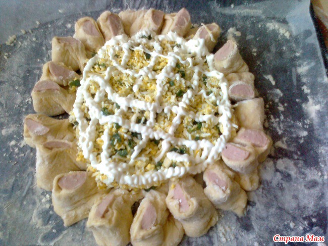 Краем теста завернуть эти сосиски.