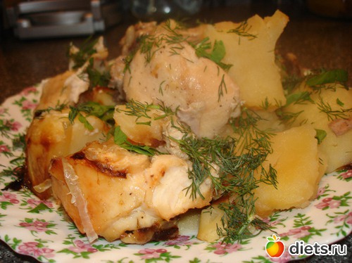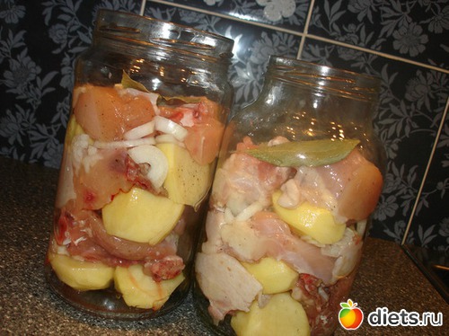 Курицу порезать на порционные кусочки, они должны быть такого размера, чтобы проходили в горлышко банки. Картофель так же порезать (если некрупный, можно целиком)