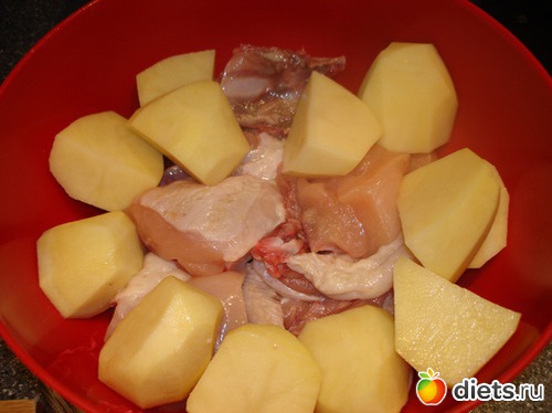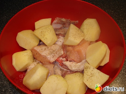Курицу и картофель солим и перчим, перемешиваем