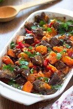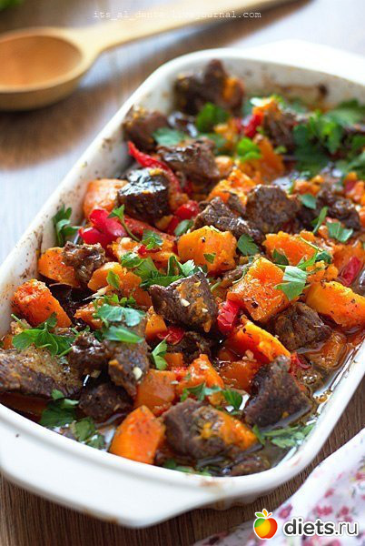 1. Тыкву очищаем и режем кубиками. Режем перец. Небольшими кусочками нарезаем мясо. Солим, перчим, натираем молотой паприкой.
