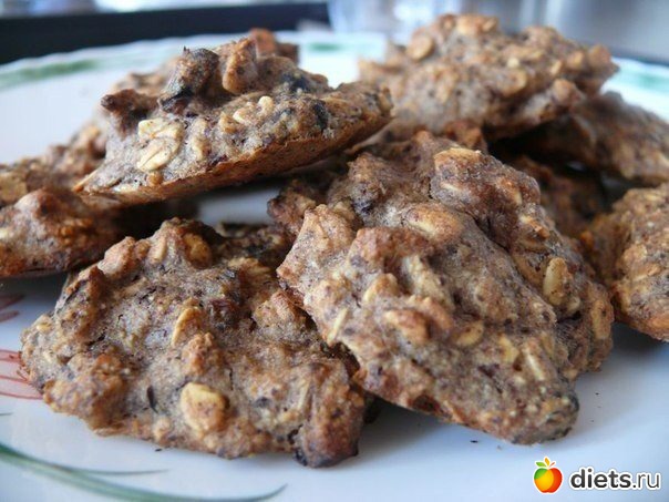 состав: 120 гр овсянки, 10 гр горького шоколада, 40 гр. чернослива, 5 гр изюма, 1 банан, 80 гр молока, 10 гр меда. (получается небольших печенек штучек 15-20, пекла на пробу)