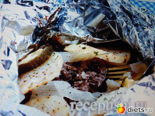 Это один из простых рецептов приготовить вкусный ужин - запеченный в фольге мясной фарш с овощами. Нарезаем, закладываем в конвертик из фольги и в духовку.