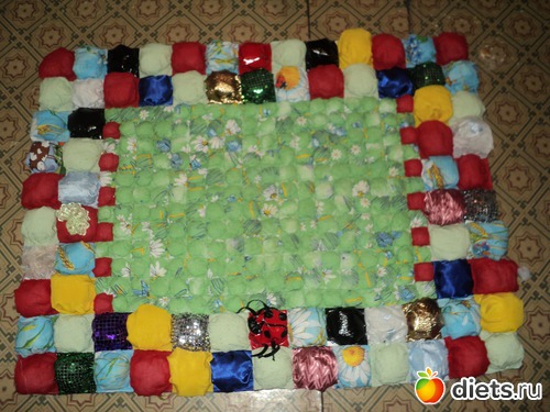 коврик легко сделать развивающим используя для верхних деталей подушечек разные ткани и наполнители(сентипон, пенопласт, бусы, фольга или хрустящй целлофан). моему ребенку больше всего нравится мешочек с пенопластом!