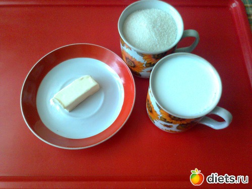 Нам понадобится 1 стакан молока, 1 стакан сахара, 20 г. сливочного масла.