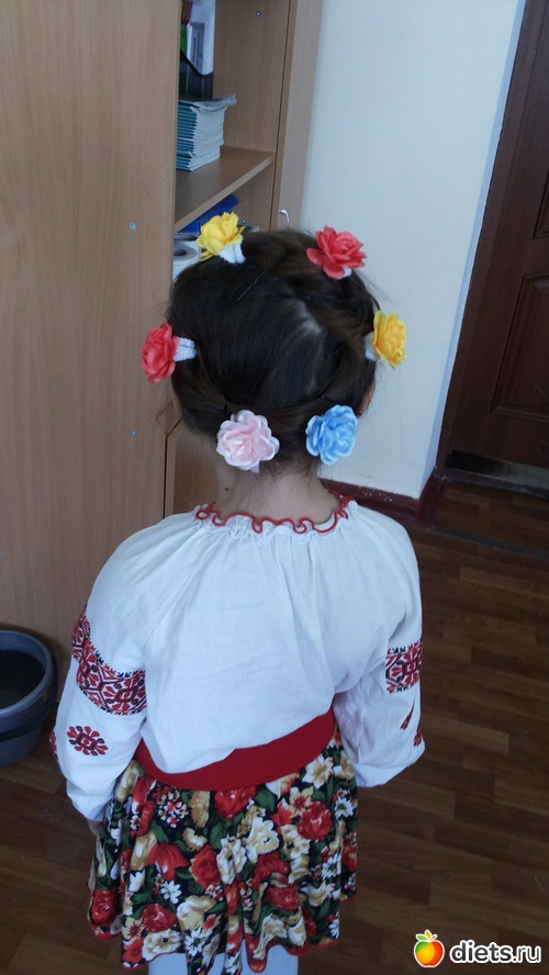 (не стала венок покупать, потому что не стоят они своих денег, да и и стыдно вообще на ребенка такое одевать, поэтому сделала ей венок из резиночек, хорошо что женщина одна на рынке подсказала как это сделать