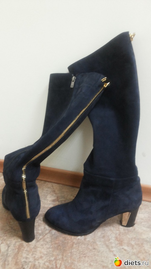 Новые сапожки себе купила замшевые темно-синего цвета, сзади молния золотая: