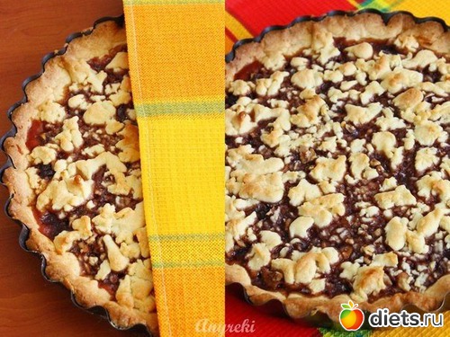 5) Выкладываем на получившуюся основу варенье, выравниваем. Сверху посыпаем варенье измельченными орехами.