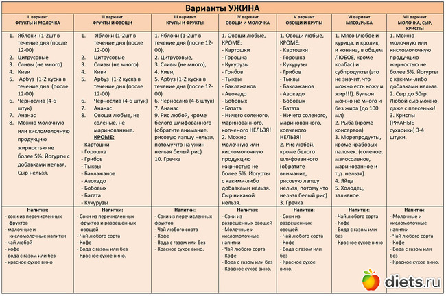 Сочетать между собой можно только продукты из одного варианта, кроме Варианта №6 "Мясо, рыба"