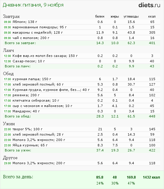 Сегодня ем - упираюсь Повышаю калораж! Хотя сейчас посмотрела я ем в среднем 90 гр. белка. Это разве мало? Вот сложных углей не хватает... Это да! Не очень люблю гарниры, но я над этим работаю!