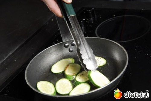 На раскаленную сковородку наливаем масла и обжариваем в нем кабачки до румяной корочки. Делаем это частями.