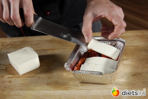 Нарезаем пластина сыр фета.