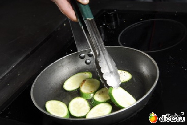 На раскаленную сковородку наливаем масла и обжариваем в нем кабачки до румяной корочки. Делаем это частями.