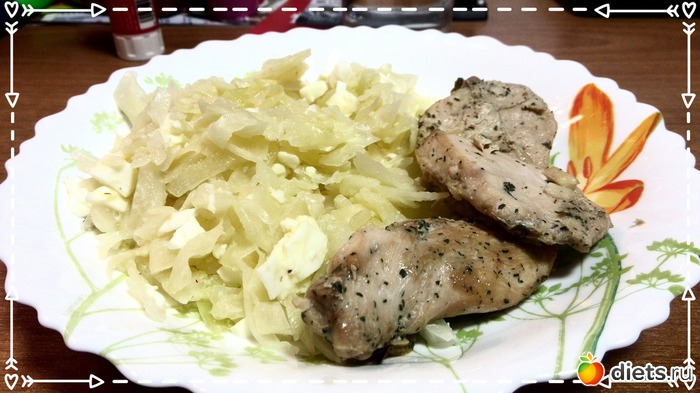 А порция... Мне кажется, это я так сфоткала, тк на самом деле - это 2 маленьких и тоненьких кусочка грудки и 2 ст. ложки капусты!!!)))