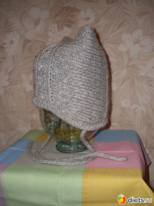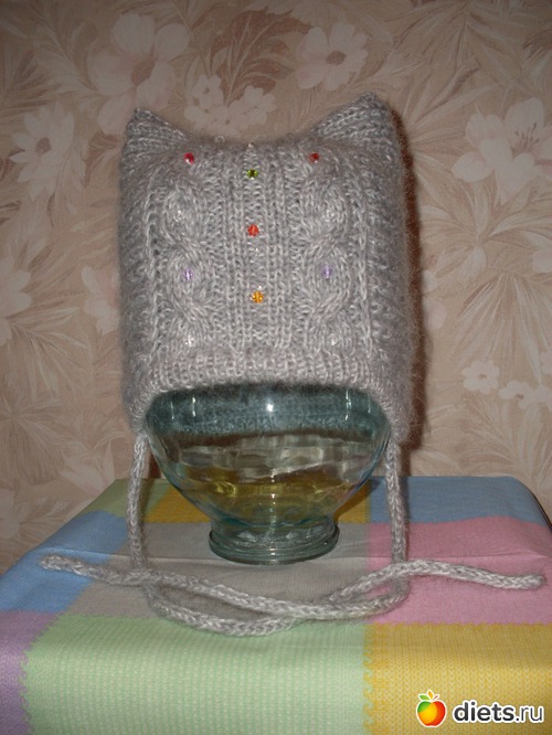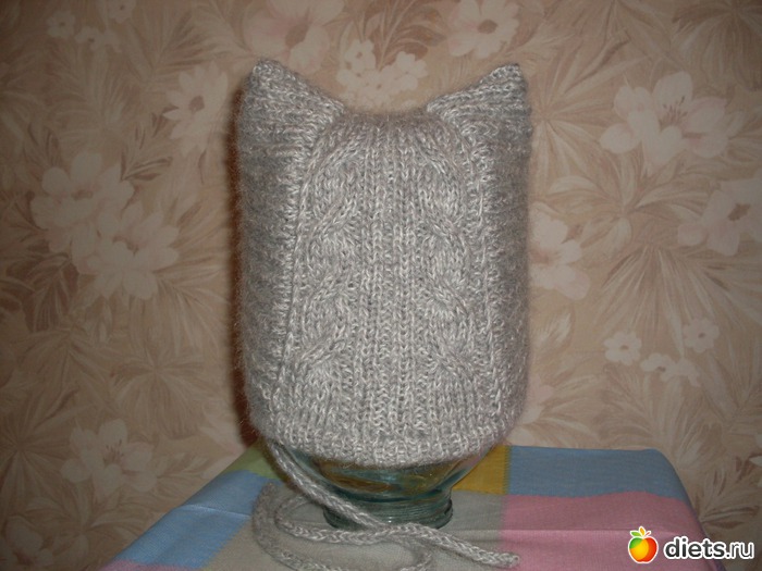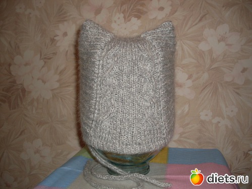 Можно в нете набрать: котошапка МК. Правда я немного по своему вязала (чтобы ушки закрывала шапочка и обвязку делала)