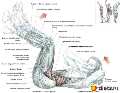 Обратные скручивания начинаем из положения, когда бедра перпендикулярны полу. И так же, прижимая поясницу к полу, тянем таз к груди. Когда мы опускаем бедра ниже, опять включаются мышцы, перегружающие поясницу.