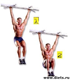 Подъем ног в висе начинаем не из полного виса (полный вис очень вреден для поясницы из-за особенностей крепления пояснично-подвздошных мышц, да и мышцы брюшного пресса начинают работать только от положения, когда бедра примерно параллельны полу, так что подъем ног в висе делаем с полусогнутыми ногами, желательно из положения, когда бедра параллельны полу, так же приводя лобковую кость к грудине, стараясь сгибаться только в грудном отделе и сохранять положение поясницы - не раскачивайтесь и не дергайтесь, фиксируйте положение корпуса, напрягая плечевой пояс).