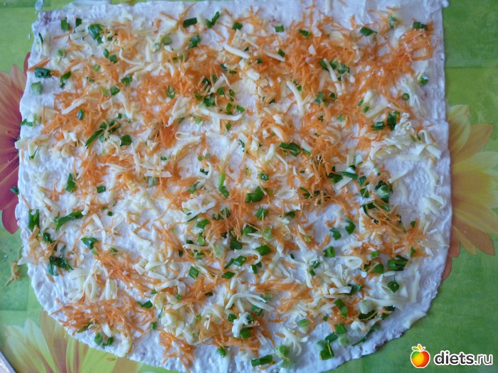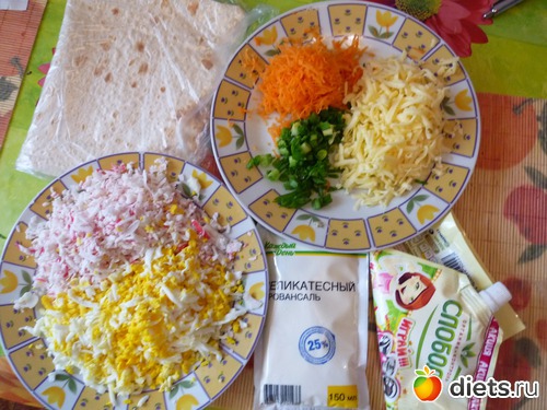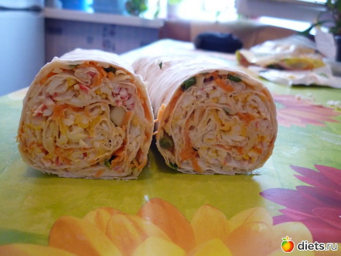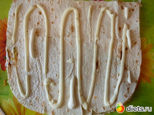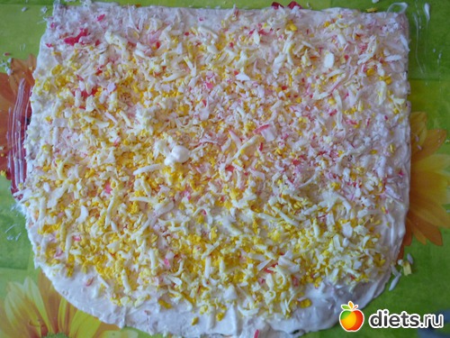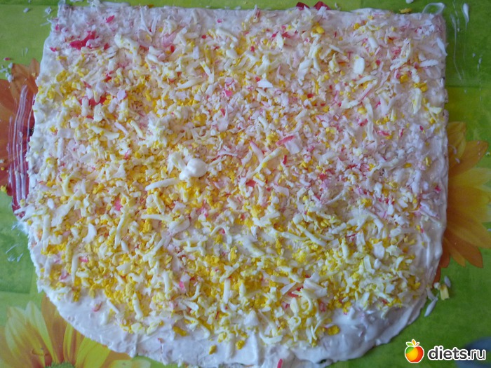 Сверху кладем второй лист лаваша, снова смазываем майонезом и выкладываем крабовые палочки и яйца
