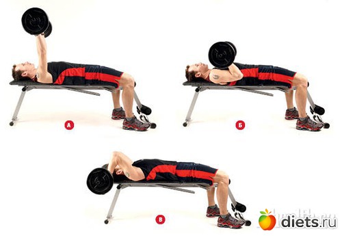 Нужно лечь на лавку, согнув ноги и взявшись за гриф хватом чуть уже плеч. Штангу поместить над собой на почти прямых руках (А). Опустить снаряд к груди, как при выполнении жима лежа узким хватом (Б). Теперь, не расслабляя трицепсов и не меняя угла в локтевом суставе, опустите гриф назад за голову (В). Двигаясь в обратном порядке, вернитесь в исходное положение.