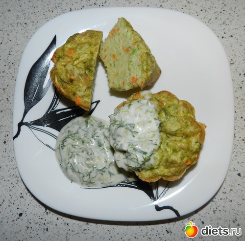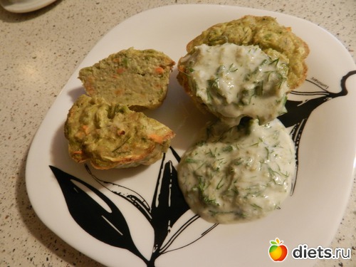 Для начала - отварить брокколи (в кипящую воду на 6-8 минут). Цуккини и морковки почистить и натереть на крупной терке. Отруби залить 100 мл теплой воды и оставить до размягчения. Готовую брокколи мелко порубить ножом, смешать с натертыми овощами, туда же натертый на мелкой терке чеснок и мелкорубленую зелень. Добавляем яйца, муку и отруби. Солим. (у меня миска очень большая с этого количества получилась, на 18 маффинов.