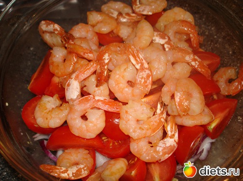 Добавляем наши обжаренные креветки (можно несколько штук оставить для украшения)
