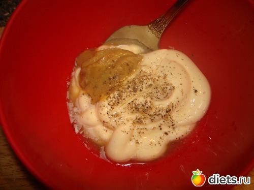 Готовим соус. В майонез (3-4 ст.л.) добавляем 0,5-1 ч.л. горчицы, перец и 1-2 ч.л. лимонного сока