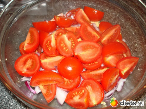 Сюда же добавляем нарезанные черри (если крупные на 4 части, мелкие пополам)