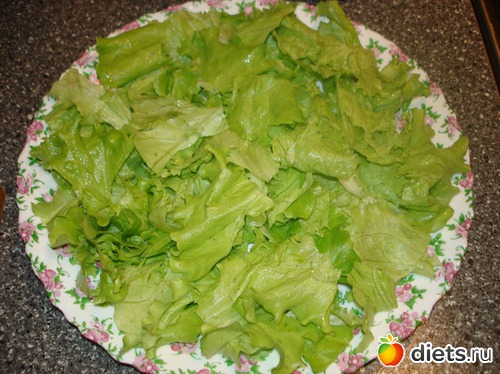 Хорошо перемешиваем и заправляем салат. На большую тарелку выкладываем салатные листья (я их рву руками)