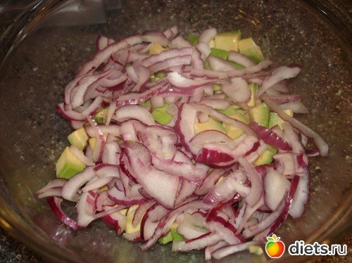 Лук нарезаем полукольцами (я взяла половину луковицы), выкладываем к авокадо