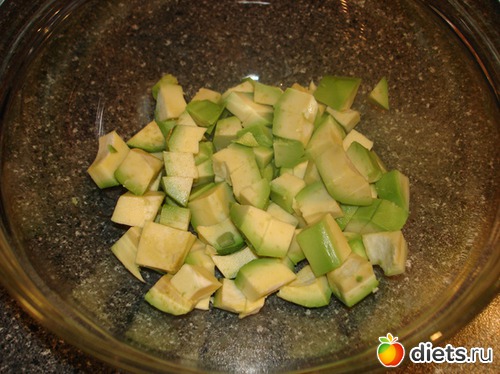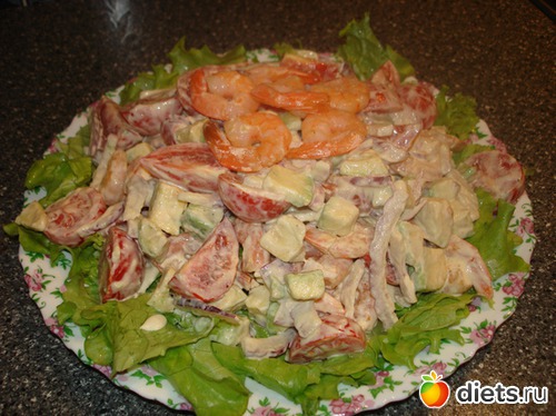 Несколько столовых ложек растительного масла разогреваем и обжариваем, креветки минутки 2-3 и выкладываем их в тарелку, чтобы остыли. Авокадо разрезаем, удаляем косточку и нарезаем кубиками, сбрызгиваем лимонным соком