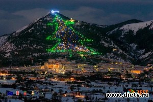 Остроумные итальянцы решили удивить мир по другому: они «изображают» исполинскую елку при помощи гирлянд электрических лампочек на склоне горы Инджино в местечке Губбио. Этой традиции тоже много лет и размеры «плоской» елки также растут из года в год. В этом году в церемонии «зажжения» елки принял участие сам Папа Римский Бенедикт XVI. 7-го декабря понтифик «включил» елку из своей резиденции, нажав кнопку на специальном Андроид-планшете. Елка в этом году получилась высотой 827 м и шириной более 400 м, ее видно на расстоянии до 50 км.