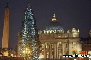Не имея возможности найти нужное дерево на своей крошечной, сплошь заасфальтированной территории, Ватикан традиционно получает рождественскую ель в дар от одной из католических провинций (очередь расписана на много лет вперед). В этом году елку доставили из Закарпатья. 30-ти метровая красавица установлена на площади Святого Петра (Piazza San Pietro) – главной площади католического мира. Она украшена тысячами золотых и серебряных шаров, километрами разноцветных гирлянд.