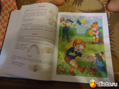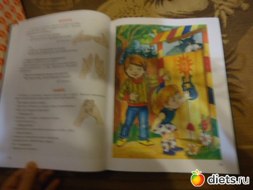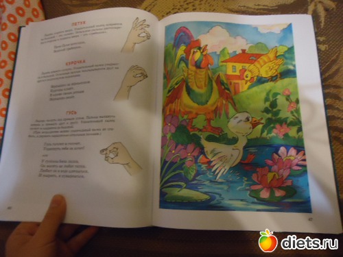 книжку вчера изучали,малой понравилось.козу ручками показывали,коровку,еще кого то,ааа...фонарики-включили выключили.еще упражнения с языком делали.сейчас сидит рассказывает кто на обложке нарисован,там много зверей.