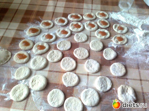 Выкладываем начинку. У меня повидло. Поэтому у меня сегодня будут пирожки. В следующий раз положу начинку из мяса и у меня получатся беляши.