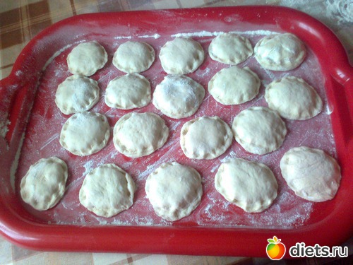 Раскатываем лепёшку толщиной с палец. Стаканом вырезаем круги (чтобы не прилипало, стакан обмакивать в муку). Делаем чётное количество лепёшечек.