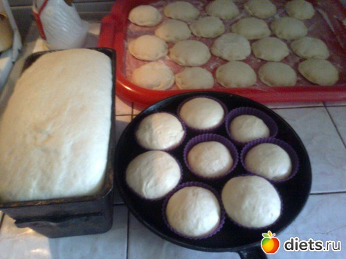 Осаживаем тесто и делим его на две одинаковых части. Одна часть у нас пойдёт на выпечку хлеба, из другой части теста будем печь шанежки и пирожки-беляши. Если у кого то нет формы для выпечки хлеба, можно выпекать в сковородке. Перед закладкой теста, форму для хлеба смазать маслом. На фото в силиконовых формах (8шт) наши шанежки. Это тот же хлеб, только ма-а-а-ленький. Это муж так их называет. Детки его очень любят. У соседки внучек очень плохо ест, пришлось ей покупать силиконовые формы, что бы печь шанежки. Ой, отвлеклась от теста. На шанежки пошла половина теста от той большой половины (1/4 часть от всего теста). Разложили по формам, накрываем всё и пусть подходят