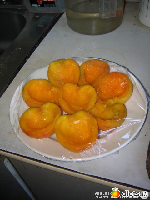Шаг 1. 4 персика аккуратно разрезать пополам, удалить косточку и ложкой вынуть часть мякоти. Закрыть пленкой и поставить половинки персиков в холодильник.