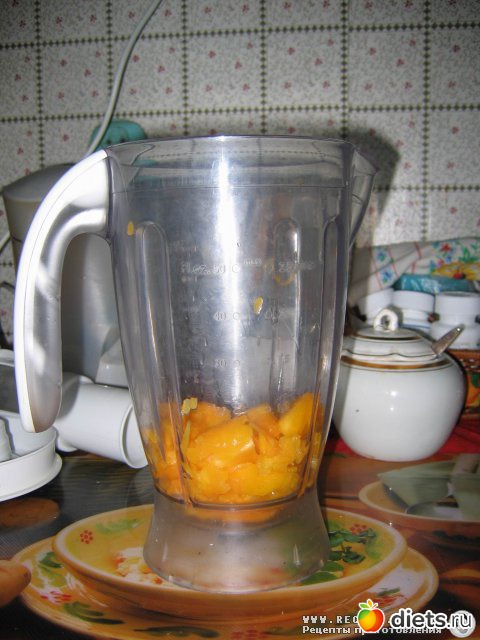 Шаг 2. Оставшийся персик очистить от кожицы, удалить косточку и измельчить в блендере вместе с мякотью других персиков.