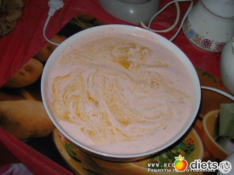 Шаг 7. Выложить в большую емкость клубнично-йогуртовую смесь, затем персиковое пюре с имбирем. Слегка перемешать, но не до однородности, а создавая "мраморность".