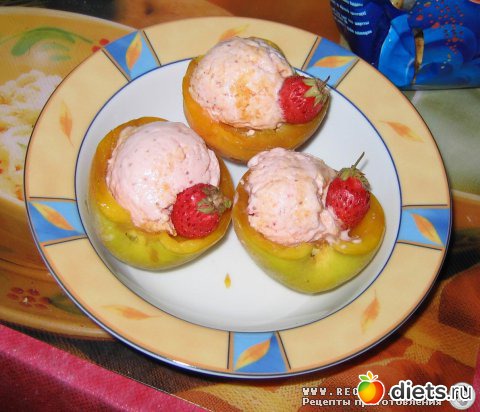 Готовое парфе можно подавать в половинках персиков, украсив ягодками клубники.