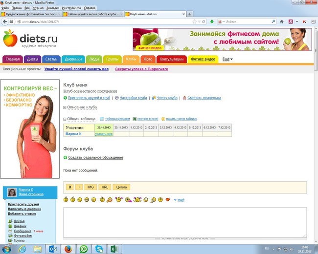 Но зато теперь я получила ответ на свой собственный вопрос к себе - Как мне самой указывать вес в таблице?Оказывается надо просто ежедневно в своём профиле указывать текущий вес и он автоматически перенесётся по адресу, т.е в таблицу клуба.