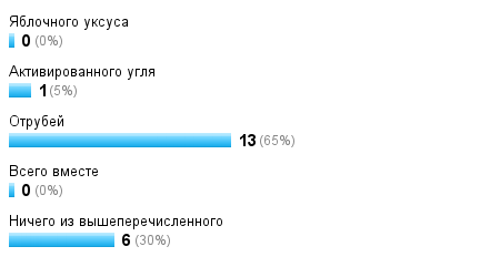 А теперь собственно вопрос с присоединенным голосованием... Раньше, перед полноценным ужином я делала для себе некий "взрывоопасный коктейль" смешивая все подряд, а именно, выпивала перед ужином 5 таблеток активированного угля, съедала десертную ложку отрубей и запивала все это стаканом воды с одной чайной ложкой яблочного уксуса. Так как моя проблема в том, что я бесконтрольно обжираюсь, а особенно за ужином, это был некий способ заполнить желудок и по возможности немного притупить аппетит. Мне бы хотелось, чтоб те, у кого был опыт похудения с помощью данных средств, поделились своим опытом.