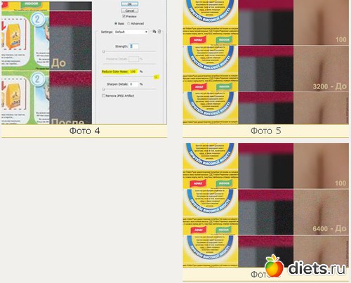 Хроматический (цветной) шум кажется меньшим злом. Двинув ползунок Reduce Color Noise до максимального значения (фото 4) резкость текста не снижается, цветовые шумы почти исчезают, но объекты небольшого размера теряют насыщенность цвета (посмотрите на красное и синее поле). Так же обратите внимание, что вокруг красных плашек образуется цветной ореол. Иногда, такое изменение цвета мелких деталей может быть критичным и невозможным для фотоснимка. Поэтому, надо стараться применять шумоподавление в минимальной степени: для ISO 3200 я применил значение Reduce Color Noise 70%, а для ISO 6400 – 100%.