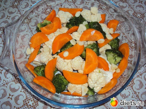Цветную капусту и брокколи разделить на соцветия, морковь порезать колечками(если крупная, то полукольцами), чеснок нарезать тонкими пластиночками, перемешать,