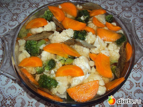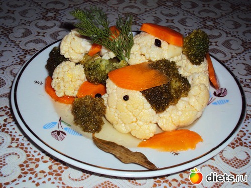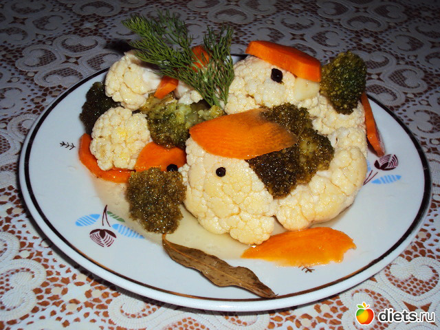 Предлагаю рецепт замечательной закуски из морковки и двух видов капусты - цветной и брокколи. Этот рецепт на днях попался мне в интернете(правда без брокколи) и я решительно воплотила его в жизнь! Вы не поверите - это таааак вкусно, невозможно оторваться!!!