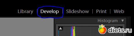 Сначала нам нужно загрузить наши RAW-файлы в Lightroom. Есть несколько способов это сделать, но я использую самый простой, по моему мнению – перетягиваю папку с РАВами на значок Лайтрума и программа сразу открывает все файлы в папке. У Лайтрума очень мощный Каталог фото, называемый LIBRARY. В нем можно задавать мета-данные, сравнивать фото, путешествовать по папкам с фото, которые были в работе раньше и т.д. и т.п., но сейчас сосредоточимся на редактировании RAW-файлов, а не на их хранении и упорядочивании. Для обработки (редактирования) фото, переходим в DEVELOP режим, который можно выбрать сверху окна интерфейса Лайтрум: