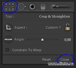 И выделяем квадратом ту область фото, которую хотим оставить. В этой же панельке можно повернуть фоту на несколько градусов (бегунок Angle) или провести прямую линию, по которой Лайтрум сам выровняет изображение (Straighten tool – очень полезно, если в кадре есть горизонт). После операции кадрирования (кстати, советую соблюдать правила композиции и кадрирования) нажимаем кнопку Close и продолжаем редактировать уже кадрированное фото.