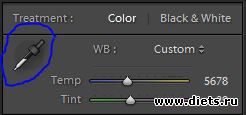 Передвигая 2 бегунка мы ищем правильный цвет. На панельке WB так же присутствует Пипетка (White Balance Selector). Кликнув по ней и потом на сером цвете на снимке, Lightroom сам решит, какой ББ правильный для этого снимка. Снимая в студии и применяя эту пипетку – я не находил приемлемого для себя результата, поэтому, опять же, подбираю все на глаз. К тому же, более теплые оттенки (побольше число Кельвина) лучше подходят для портрета, и автор фото может нарочно увести бегунок ББ вправо.