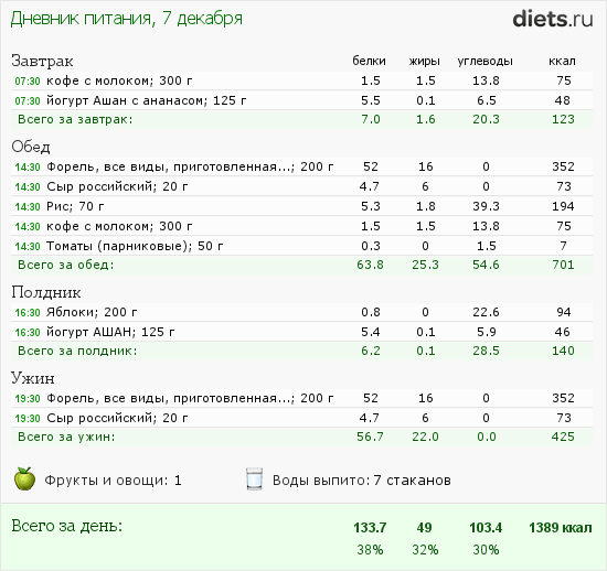 У самой такая проблема...вот теперь только поняла, что делать, чтобы их меньше было: жирные сорта рыбы - в мусор; курицу только варёные грудки (в них почти нет жира). Если бы вы съели на ужин не 200г форели, а 200 г куриной грудки, белков было бы побольше, калорий на 150 меньше (т.е. Около 1240 за день, это больше 1200, это нормально), а жиров на 15-16 г меньше! Т.е. За день было бы около 34, что тоже много, но лучше чем почти 50)