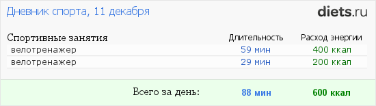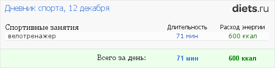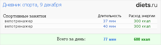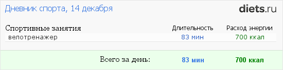 зарядка/занятия дома(велотренажер: около 1 часа в день; упражнения с гантелями: руки, ноги(приседания, выпады), пресс(наклоны, скручивания); растяжка) - 7 раз в неделю, то есть каждый день;