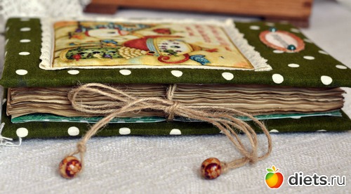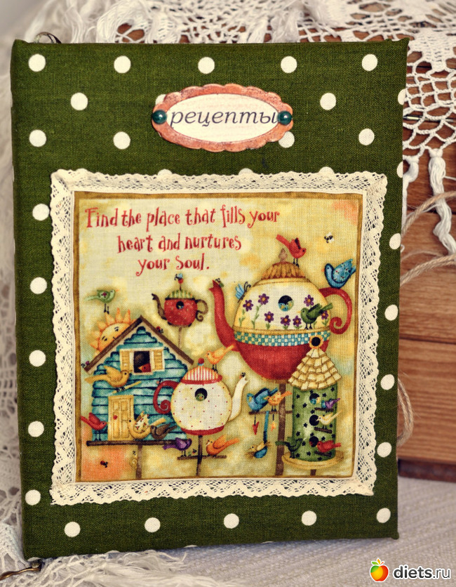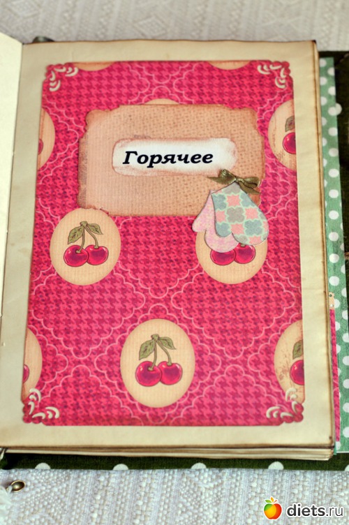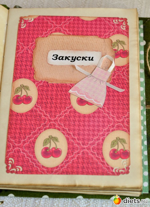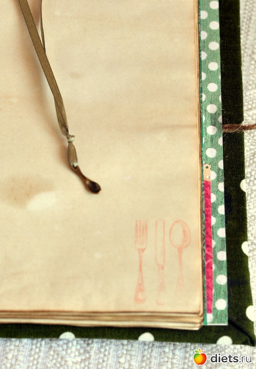 Кулинарная книга Очень мягкий и по деревенски уютный блокнот для самых любимых рецептов. Странички в нем состарены с помощью кофе. Внутри четыре подписанных раздела: "Закуски", "Горячее", "Десерты" и "Погребок", каждый из них оформлен и каждая страница к каждому разделу проштампована разными штампами по теме в названии самого раздела. На заднем форзаце есть кармашек для мелких вырезок. Есть закладка, на конце которой подвеска - крохотная ложечка.